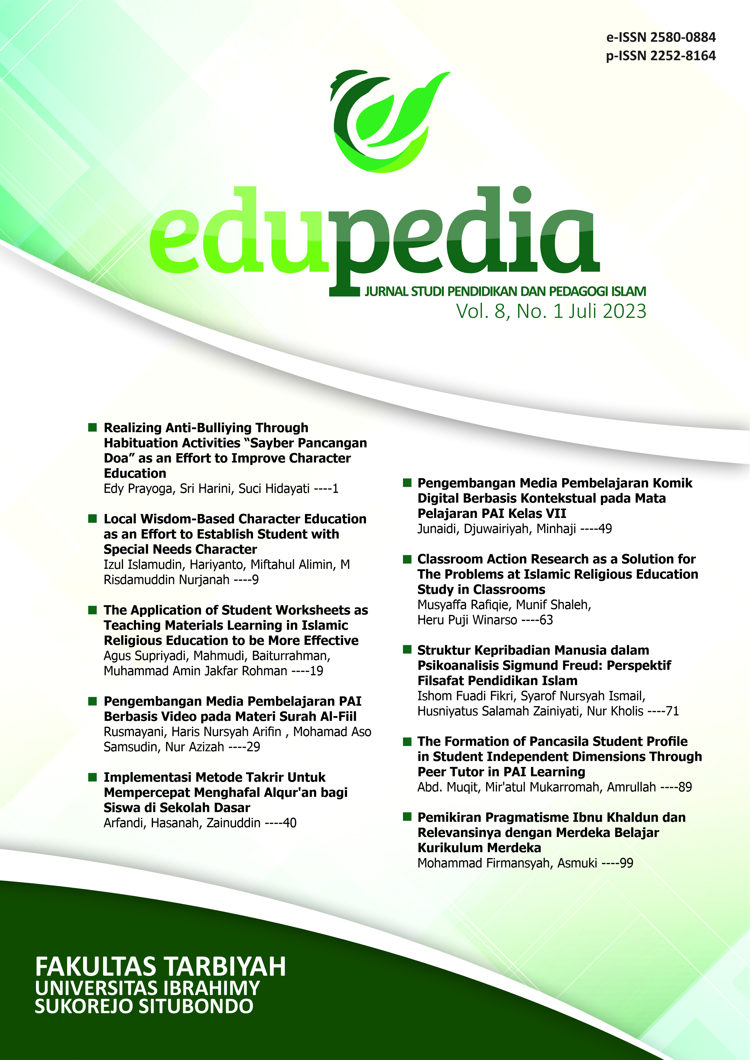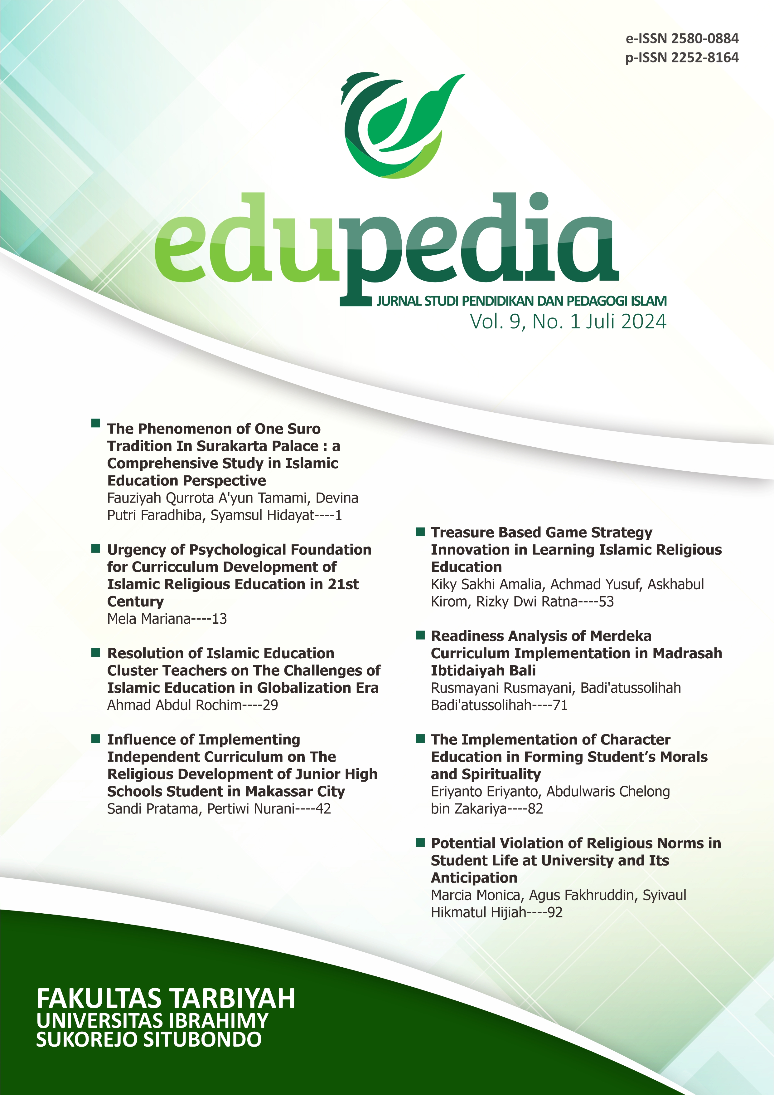 Vol. 9 No. 1 (2024)The board of editors expresses highest appreciation to all authors from various universities in the world who had participated submitting the best research manuscript to Edupedia: Jurnal Studi Pendidikan dan Pedagogi Islam. The next volume, we will further build upon what we have nurtured from the best quality of research article published in our journal become the best solution for citizen.